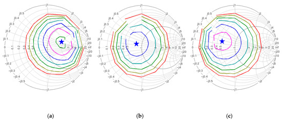 Load-pull simulation results of the proposed reconfigurable PA for the three modes: (a) cascode inverter configuration, (b) double-stacked cascode inverter configuration, and (c) double-stacked inverter configuration. The contour starts from an output power of 0 dBm (red circle), and the contour levels are in steps of 1 dB.