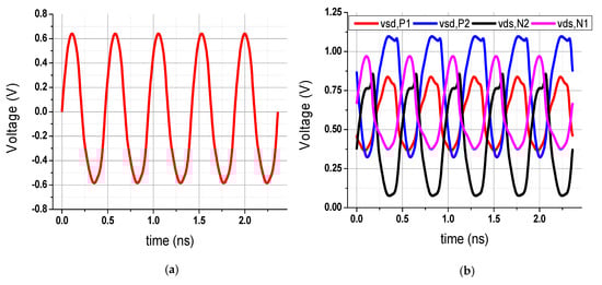 Simulated (a) output voltage waveform, (b) source-to-drain voltage waveforms driven by MP1 and MP2 (vsd,P1 and vsd,P2), and drain-to-source voltage waveforms driven by MN2 and MN1 (vds,N2 and vds,N1) when the proposed PA in the cascode inverter configuration generates an output power of +3 dBm under a 100 Ω load impedance.