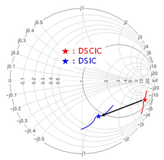 Simulated output impedance of the PA with double-stacked cascode inverter configuration (DSCIC) and double-stacked inverter configuration (DSIC).