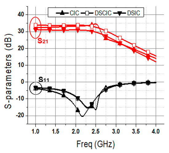 Simulated S-parameters of the proposed reconfigurable PA operated in the cascode inverter configuration (CIC), DSCIC, and DSIC.