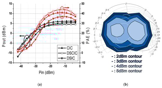 In the simulation results, the proposed PA operated in CIC, DSCIC and DSIC shows a Psat of +6.1 dBm and a peak PAE of 41.1% under a 100 Ω load impedance, a Psat of +4.5 dBm and a peak PAE of 44.3% under a 50 Ω load impedance, and a Psat of +5.2 dBm and a peak PAE of 37.1% under a 25 Ω load impedance, respectively. Figure 8b shows the simulated total impedance coverage of the proposed reconfigurable PA, while maintaining the output power of greater than +2, +3, +4 and +5 dBm. Compared to conventional inverter-based PAs, impedance coverage is significantly extended, while output power that exceeds the specific power level is maintained without sacrificing power efficiency using only hardware reconfiguration. The proposed PA can compensate for antenna impedance mismatch without any inductors or transformers, and can have the same effect as a TMN at the output stage.