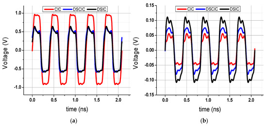Simulated output voltage waveforms of the complete PA according to the change of circuit configuration under (a) a 200 Ω load impedance and (b) a 5 Ω load impedance. The RF sinusoidal signal with a power of −10 dBm was applied in order to achieve an output power close to Psat.