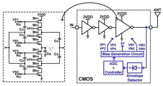 Figure 1a shows a schematic of a conventional three-stage inverter-based PA. The hardware configuration is very simple, because there are no inductors or transformers, and as a result, it is easily implemented in a low cost digital CMOS process The previous works of Paidimarri et al. [11], Kiumarsi et al. [12], and Van Langevelde et al. [13] presented the inverter-based, push-pull topologies for PA applications, but there was no study for compensating the antenna impedance mismatch effect with the same RF performances. The first and second stages are drive amplifiers (DAs) for boosting the weak input signal with sufficiently high gain and extremely low power consumption, and the last stage is the output stage for obtaining maximum output power under the given load condition. Instead of using a dc biasing method with a shunt feedback configuration, a replica biasing circuit is adopted to provide a stable dc operating point to the inverter stage, and to ensure a rail-to-rail output swing. By adjusting the channel width ratio between the NMOS and PMOS transistors, the dc operating point of the inverter stages is around half of VDD. Compared to a common-source topology with an inductor load, the output voltage swing of the inverter-based PA is reduced by almost half. As shown in Figure 1b, its output voltage swing is expressed as
