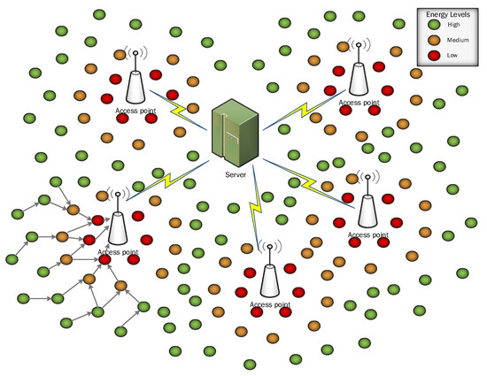 The proposed approach uses communication optimisation through traffic minimisation and thus helps in relieving the bottleneck issue possible due to hierarchical setup. This problem can be better explained through an example scenario, as presented in Figure 2. The nodes near sink are critical and solutions such as those proposed in this paper are needed to prolong its lifetime by avoiding unnecessary forwarding as otherwise the network will soon be disconnected.