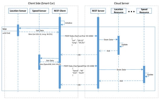 Figure 3 shows a scenario to the illustrate inefficiency of REST architecture in IoT sensing applications submitting data to the cloud. Here, we have an IoT device attached to a smart car containing two sensors, which is posting data to a cloud server. Each sensor needs to send its data to a separate resource at server through its exposed endpoint. By using the REST architecture, multiple requests are needed to submit data to each resource. Many examples of more complex scenarios can be easily found in real-world IoT applications, e.g., a smart car having multiple sensors such as speed sensor, acceleration sensor, location sensor, engine and fuel status sensors. Here, for the sake of clarity in the example scenario, only two sensors are being considered, i.e., location sensor and speed sensor. Data collected from these two sensors need to be sent to a cloud server where each sensor node has a separate resource defined for its data, with a unique REST endpoint, i.e., /Car/Loc and /Car/Speed. Each sensor datum will require a separate POST request and, therefore, in a smart city having thousands of smart cars and other IoT devices, we can easily imagine the explosion in the network traffic. As a result, IoT applications can suffer network congestion, resulting in packet losses and energy wastage.