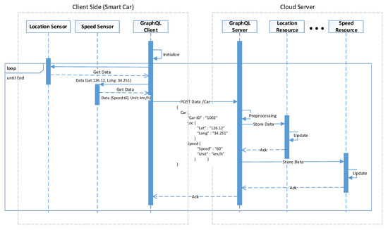GraphQL enables flexible queries on linked (No SQL graph-based) data and its single endpoint approach is backed by a structured hierarchical system for combining data of various sources. It does the representation of data as set of nodes which is able to have nesting and relations with other nodes. Its query is a set of hierarchical data fields requested and only those which are required are returned to the client, resulting in reducing the size of data. Data requests are to be sent to a unique endpoint for the unification, which means it requires a single URI to present all available data via its single API. Figure 4 presents same example IoT scenario of a smart car with two sensors to illustrate the working of the GraphQL-based client–server system. We can observe that, unlike REST architecture, data from multiple sensors can be posted to the server in a single transaction. This way its reduction in the number of round trips makes efficient use of available resources of the IoT network.