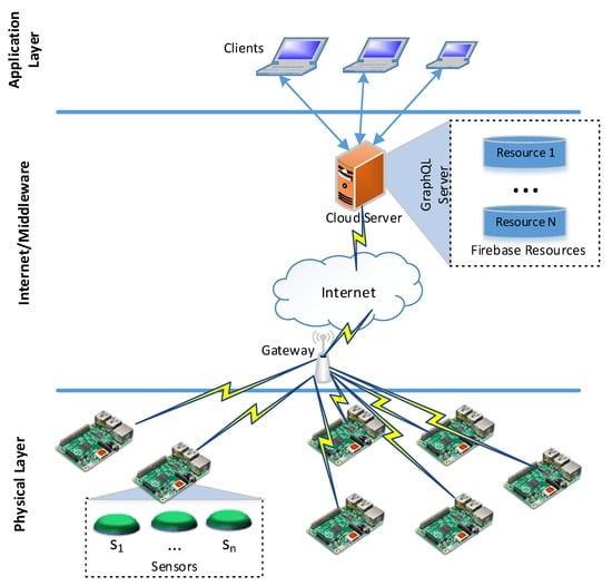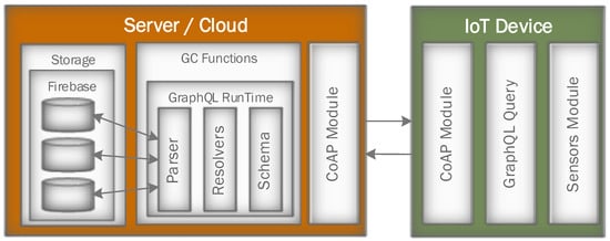 The proposed approach for wireless sensor networks-based IoT applications involves cloud services and maintaining client–server architecture, where implementation is running client side on sensor nodes and cloud services are providing residence for the server side. We integrate the GraphQL abstraction module on our client side in the form of GraphQL query language and we incorporate its default module named as Runtime on the server side hosted in Google cloud functions. This implemented Runtime provides data exchange according to the configuration by clients where they can mention the filters, operations and structure of the received data in the aggregated queries. Figure 5 presents the block components of the proposed scheme integrating cloud services, web framework, and interfacing with IoT CoAP protocol, showing their positions on client/server side of the system.