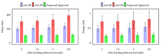 In this scenario, we have single IoT device (Z1 mote) with multiple sensors attached to it, and the data are posted to separate resources on the cloud server. Here, we show delay and energy consumption results on increasing transaction loads (in form of data sending interval) in Figure 10. The results were collected with varying packet sending interval from 2 to 0.5 s, with a step size of −0.5. With an increase in data sending rate, we observe increase in the delay values. REST-based scheme with three resources subscribed suffers greatly and around 100 ms delay increase is observed when the data sending interval is reduced from 2 to 0.5 s. However, the proposed scheme results in the lowest delay for all the cases. Furthermore, we observe the increase in the delay for it is marginal with increase in data sending rate, which shows that the proposed approach is more robust and resilient, and hence more suitable for IoT sensing applications.