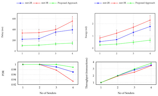 This scenario has device configurations as in Scenario 1, but we varied the number of IoT client devices (number of Z1 motes ranging 1–4) in a dumbbell-shaped network topology, having all the devices/senders in direct one-hop connectivity to the border router/cloud gateway. Here, offered/data load increases in the form of multiple active senders ranging from one to four devices. Comparisons was done among: (i) rest-2R (nodes registering data to two resources with separate endpoints); (ii) rest-3R (sender nodes submitting data to three separate resources at the cloud with CoAP server); and (iii) using proposed framework implementation for sending data to three cloud resources. Here, we also show results for PDR and system throughput (in terms of number of successful data transaction) in Figure 11, because all the sender devices are in the same contention area to the border node in the used topology. For both values, the proposed scheme shows better performance in comparison to REST architecture.