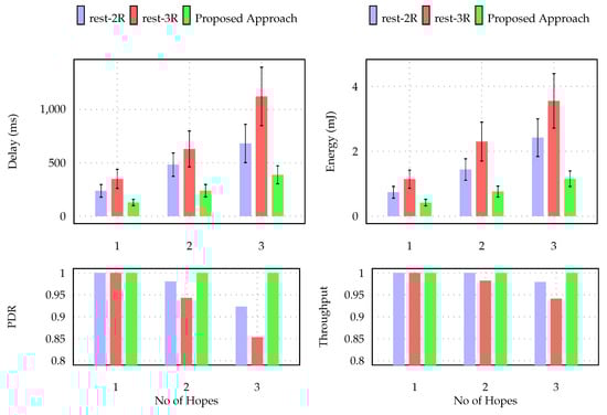 In this scenario, we tested the performance of our proposed system implementation for hop-by-hop communication in IoT sensing application. We used four Z1 nodes in these experiments, with one mote acting as border router/gateway and three motes as set of hop-by-hop sending devices. We collected results for four metrics: delay, energy, PDR, and throughput. Our results, as shown in Figure 12, clearly establish that proposed scheme is much better in energy consumption as well as all the other three metrics. In hop-by-hop communication with increasing distance in terms of hops, energy consumption and delay increase for the proposed approach is normal. However, REST-based approaches, especially 3R-rest communication, face disastrous output in the maximum three hop case. Similarly, packet loss for rest-2R and rest-3R are higher when the number of hops is increased but the proposed architecture maintains its PDR as well as throughput results. It significantly outperforms the REST schemes on all the metrics.