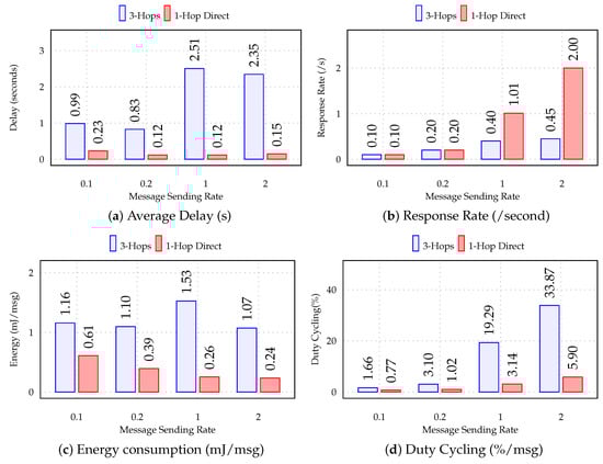 Response Receive Rate: The response receiving rate on increasing request rates in Figure 13b are very encouraging and, on high data rates, direct connectivity scenario delivers all the data in time. The hop-by-hop case suffers severely at high load rates and is unable to deliver the data even in reasonable time. On two requests per second rate, direct transmission delivers at two packets per second, whereas hop-by-hop communication is only able to deliver at 0.45 packets per second. It is 4 times less than request sending rate as well as delivery rate of multi-hop case. On high data sending rates of 1 and 2, to complete the total 100 request/response exchanges, direct connectivity case needed 100 and 50 s, whereas hop-by-hop communication took 253 and 244 s, respectively. This is one of the major reasons for high energy usage for three-hop case because it has to run for 2.5–5 times longer, utilising the extra power.
