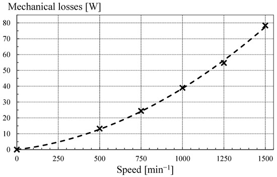 Mechanical losses are usually calculated from four or more constant loss points between 30% and 60% of the rated motor voltage by developing a curve against no-load voltage squared and then performing linear extrapolation to zero voltage [1,2]. The intersection of the extrapolation curve with the vertical axis then corresponds to the mechanical losses. However, mechanical losses are speed and temperature-dependent [2]. Therefore, to obtain the dependence of the losses on speed, several tests with a variable harmonic supply voltage created by an SG were performed. The motor-rated voltage was recalculated for each frequency to preserve the same voltage-to-frequency ratio. The measured dependence is shown in Figure 1.