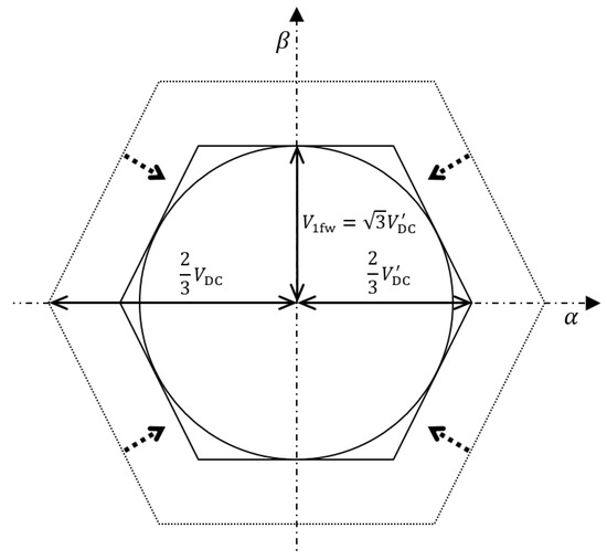 Keeping the full DC-link voltage may not be necessary for all operating points. Let us suppose that the motor winding is sinusoidally distributed and that it is only the fundamental component of the voltage that contributes to the average value of the machine torque. Under these presumptions and also by neglecting the nonlinear VSI behavior, the DC-link voltage decrease will lead to the shrinkage of the hexagon, which represents the theoretical maximum set of voltage vectors generatable by the VSI. At some threshold voltage , the hexagon will touch the circular trajectory of the fundamental voltage wave. The whole situation is depicted in Figure 3. A further DC-link voltage decrease will cause operation with an additionally distorted current waveform, and under some critical value, the speed of the drive will start dropping.