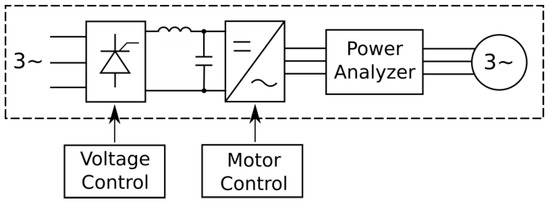Two different hardware topologies were used for the iron loss analysis. First, similarly as in the previous section, the IM was connected to the inverter controlled by the PTC algorithm in a speed loop and without a mechanical load (Figure 5). Second, the motor was connected to the SG to compare the losses between the PTC-controlled IM and the IM supplied from a sinusoidal voltage (Figure 6). The electrical power was measured by power analyzer NORMA 4000 placed between the motor terminals and the respective source.