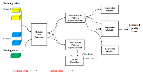 In this paper, we attempt to extract effective skeletal feature representation of human motion from an RGB video for a fine-grained human action quality assessment and develop a learning framework for assessing the action quality of sport activity. First, it is reasonable to assume that the action quality directly depends on the dynamic changes in human body movements. Therefore, in this study, we employed the OpenPose estimation method [21] to extract skeleton data from RGB videos for action quality analysis. Then, to determine the action category of test videos, we extracted the local motion pattern from each joint movement volume and aggregated all volumes to form a feature description for action classification. To accurately predict the quality score of an action video, we developed effective self-similarity feature descriptors extracted from the self-similarity matrices (SSMs) of joint trajectories and a joint displacement sequence that has been proven to alleviate the impact of camera motion in diving, figure skating, and vaulting videos. Lastly, a class-specific regression model learning strategy was employed to weigh the impact of joints on different action category evaluations. In the testing stage, with the supervision of the action classifier’s output, the target regression model was determined to predict the quality score of the testing action video. The framework of our approach is illustrated in Figure 1.