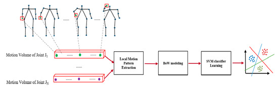 Let denote a set of joint trajectories obtained by skeleton detection for video V, where N is the number of human body joints, represents the trajectory of the kth joint, and T is the number of frames of V. Each joint position is located by its coordinates in discrete (x, y, t)-space. To capture the spatial context of joints, a dimensional local patch centered at each joint position is extracted from video frames where . All patches extracted over a temporal duration () are assembled into a motion volume of joint k, denoted by , which is illustrated by the red cuboids in Figure 3.