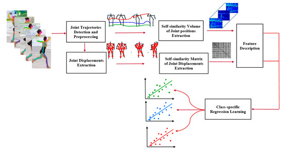 The quality assessment component of our proposed learning framework consists of the preprocessing of joint trajectories, joint displacement sequence extraction, feature extraction from the self-similarity matrix (SSM) of joint trajectories and joint displacement sequence, and class-specific regression learning. The training process of our class-specific action quality assessment component is illustrated in Figure 4.