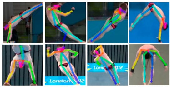 OpenPose provides the functionality of 2D real-time multi-person key point detection (15-, 18-, or 25-key point body/foot key point estimation). The 18-key point skeleton model is composed of 18 human body joints, as illustrated in Figure 2a, including the nose, neck, right shoulder, right elbow, right wrist, left shoulder, left elbow, left wrist, right hip, right knee, right ankle, left hip, left knee, left ankle, right eye, left eye, right ear, and left ear. Since action quality assessment is highly dependent on the changing positions and configuration of human body parts, the motion changes of key points on eyes, ears, and feet are not clear. Consequently, we only used the motion information of 14 body joints (N = 0~13) except for the eyes and ears for analysis. After the multi-person’s skeleton detection results were returned by OpenPose, we carried out scale computation of the human body and a key point confidence comparison to extract the target performer’s skeleton data and filter out noise data, which results from a cluttered background. In the case of occlusion or self-occlusion, zero values of the joints’ coordinate were obtained due to the failure detection of the human body. Then, linear interpolation was employed to capture the missing skeleton data from the pose estimation results of the previous frame and the next frame. In this way, the joint trajectories of the target performer were obtained. Some detection examples of diving and figure skating videos from the MIT Olympic Scoring Dataset [1] are illustrated in Figure 2b,c.
