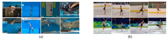 Example frames of the MIT Olympic Scoring dataset [26]. (a) Example frames of diving. (b) Example frames of figure skating.