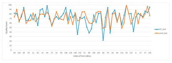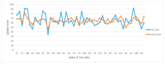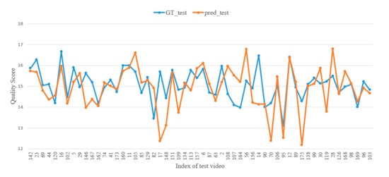 The predicted score of each testing video for the MIT diving dataset from our best rank correlation coefficient performance is presented in Figure 7. The horizontal axis denotes the index of the action video for testing, and the vertical axis represents the predicted quality score. The data series of the GT_test indicate the ground truth scores of test videos, and the pred test corresponds to the estimated scores of the proposed method.