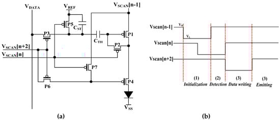During the initialization phase, P2, P5, and P7 are turned on as both VSCAN(n − 1) and VSCAN(n) are at a low level. Then the gate voltage of P4 is pulled down, and P4 is turned on for resetting the drain electrode of P1 with a relatively low voltage level, i.e., below the turning-on voltage of OLED (VOLED). In addition, the gate and the drain electrodes of the driving transistor P1 are shorted by P2 and the gate voltage of P1 is also discharged through P4, while the left electrode of CTH is initialized with VREF by P5. The electrical hysteresis phenomenon in P-type LTPS transistors should be considered, i.e., the drain-to-source current varies with different gate-sweeping directions, which relates with short-term image sticking issues [,]. As CTH is properly initialized before the programming phases, the hysteresis effects can be efficiently suppressed.