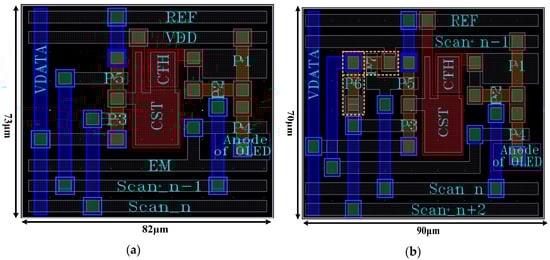 Layout of the pixel circuit. (a) The 5T2C bootstrap pixel circuit, and (b) the proposed AMOLED pixel circuit.