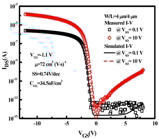 Measured and simulated transfer characteristics of the low-temperature poly-silicon thin-film transistor (LTPS TFT) with an aspect ratio of 4 μm/4 μm. COX: gate capacitance per unit area; μ: field-effective mobility; SS: sub-threshold swing.