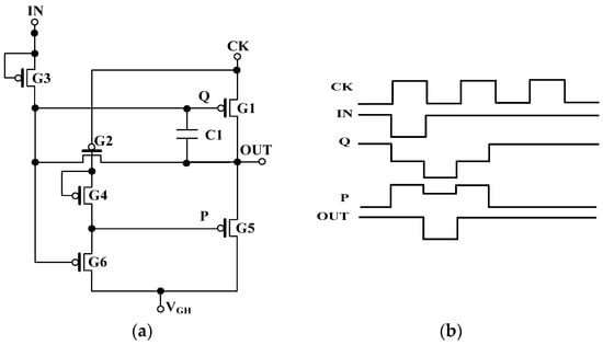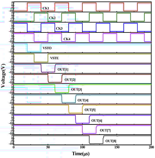 For the proposed pixel circuit, the high-to-low pulses with line-by-line scanning sequences are needed. Figure 4 shows the gate driver unit, which consists of six TFTs and one capacitor. The parameters of the gate driver unit are shown in Table 3 and the operating mechanism has been detailed elsewhere []. In order to generate the required scan signal, four clocks with overlapped waveforms are used. Figure 5 shows the block diagram of the gate driver with detection time half of the scan pulse. The simulation results are illustrated in Figure 6. The devised gate driver circuit is well verified, and a rail-to-rail output range, i.e., from −10 V to 5 V, can be obtained for the gate driver, with the rising and falling times of 1.68 μs and 1.76 μs for loading resistance of 2 KΩ and loading capacitance of 200 pF.