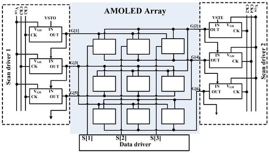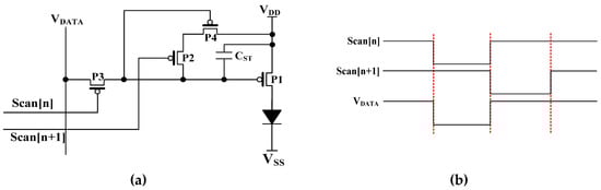 AMOLED pixel schematics can be categorized into three types: voltage programming methods [,], current programming methods [,], and external compensation methods [,]. Voltage-programming methods are mainstream for LTPS OLEDs because current programming methods need long settling times for small currents, and external compensation methods are too complicated. However, for voltage programming methods, the pixel circuit is required to correct variations in VTH, mobility, and VDD. Thus, Lin et al. proposed a feedback pixel circuit to calibrate the gate voltage distortion of driving TFTs during the light emission time []. Lee et al. re-used the scan line for supplying power to replace the conventional power line to increase the aperture ratio []. Further, to avoid image flicker, Lin et al. employed overlapping compensation waveforms to extend the VTH detection time and to suppress the OLED current during the compensation time []. These previous investigations illustrate that, through a proper circuit topology and timing diagram to offset VTH variations and IR drop, a good display uniformity can be obtained. However, for conventional schematics, the pixel circuit array requires multiple scan signals with different types, which complicates both the pixel circuit and the external gate driver circuit.