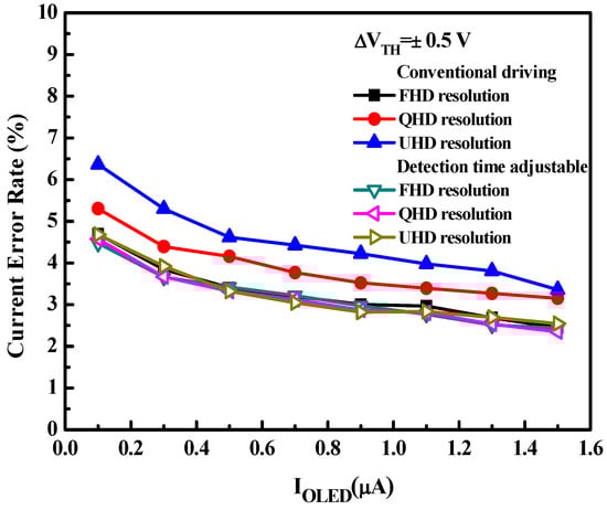 Current error rate versus IOLED for different driving schemes with various resolution formats. FHD: full-high-definition; QHD: quad-high definition; UHD: ultra-high-definition.