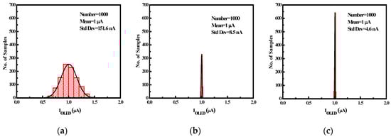 Monte Carlo analysis of the emission current with VTH in a Gaussian statistical distribution when the relative error is 20%. (a) The conventional 2T1C pixel circuit, (b) the 4T1C pixel circuit, and (c) the proposed pixel circuit.