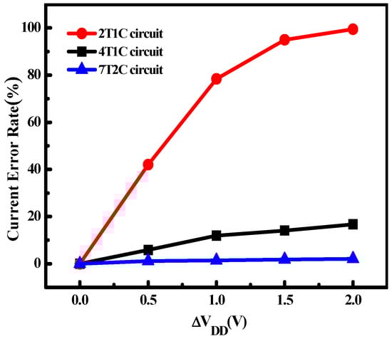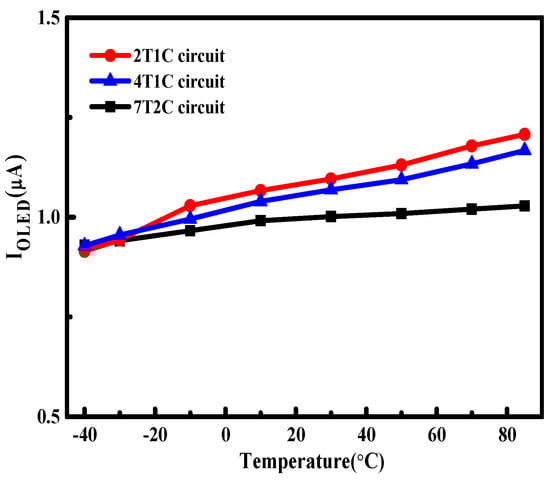 In addition, due to the metal line resistance, voltage drop along the power supply line is inevitable. For larger display panel, the IR drop effect is further deteriorated. Figure 10 shows the current error rate versus IR drop with three pixel circuits. For the conventional 2T1C pixel, abrupt current error rate is caused by IR drop. In the case VH drops from 5 V to 3 V, the current error is reduced to 16.7% and 2.1% for the 4T1C pixel circuit and the 7T2C schematic, respectively. Thus, the proposed pixel circuit shows stronger immunity to the IR drop issue than other pixel circuits, which benefits the implementation of a large-dimension AMOLED panel. For actual products, the operating temperature for AMOLED panels is in the range of −40 degrees to 85 degrees. Figure 11 shows the OLED current versus different temperature for three pixel circuits. The current magnitude is increased by 32.1% and 25.7% with the temperature increase from −40 degrees to 85 degrees for 2T1C and 4T1C circuit. The proposed pixel circuit has much reduced temperature dependence, as the current error is reduced to 10.6% for the temperature variations.