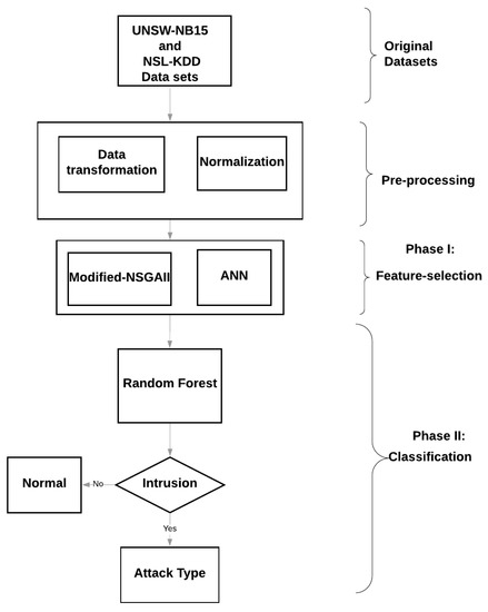 In the proposed framework (Figure 1), the original datasets are fed into the prepossessing stage, initially. In other words, the nominal values of the selected datasets are transformed into integer numbers, and all the features are normalized changing them to a standard scale, without distorting differences in the ranges of values. In phase I, the interaction between the modified NSGAII, and the artificial neural network (ANN) has built the basis of the feature-selection approach. The proposed feature-selection method would suggest potential feature subsets which could offer the optimized performance. We have modified the NSGAII approach, which is used in this phase. The modification removes the redundant feature subset solutions and improves the diversity of the offered feature subsets. In phase II, the best solution among the suggested feature subsets is chosen. Next, the samples are classified using the Random Forest method. The aforementioned classifier would ascertain whether the specific traffic could be recognized as an intrusion or normal traffic. The details about the steps involved in this framework can be found in the following sections.