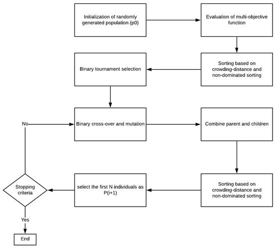 Initially, the parents in the first iteration of the algorithm are generated through a random population called (i = 0). The multi-objective function mentioned in Equation (2) will be computed, and the population will be sorted based on non-dominated sorting and crowding distance. We have defined the crowding distance and crowded-comparison operator in Section 4.2.2 where the best solution can be selected among those ones with lower domination rank. More information about this sorting process can be found in [30]. The sorted parent population in this phase will be served into the main loop of the algorithm. The binary tournament selection, binary cross-over, and mutation are applied to gain the off-springs (). In this paper, A roulette-wheel selection is employed to do the cross-over. This approach is the combination of single-point, double-point, and uniform crossovers with the probability of 0.1, 0.2, and 0.7, respectively.