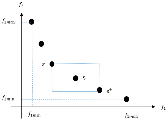 The NSGAII algorithm exploits the crowding-distance assignment to estimate the density of solutions. The crowding-distance for each solution S in the population should be estimated by the cuboid-perimeter measurement. The closest results of each individual in the same non-dominated front are involved in the measurement of this perimeter. Figure 3 depicts the cuboid illustration where and refer to the two objective functions, and filled circles indicate the similar non-dominated front solutions. The two closest solutions, and , are shown by filled circles, and the solution S is surrounded by a box which refers to the crowding-distance, estimated by Equation (5). The maximum and minimum values of in a special non-dominated front are mentioned by and .