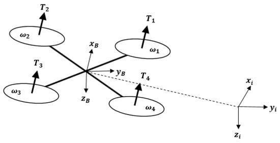 In Figure 1, the quad-rotor is driven according to the alignment direction of the propeller, can turn in three directions, and has a total of four inputs. Since it is possible to move and rotate on three axes of x, y, and z in three-dimensional space, the quad-rotor has six degrees of freedom, but the control input is four degrees of freedom. The quad-rotor has under-actuation characteristics with less control input freedom compared to system freedom. The translation equations of motion for the quad-rotor are based on Newton’s second law, and they are derived in the inertial frame [].