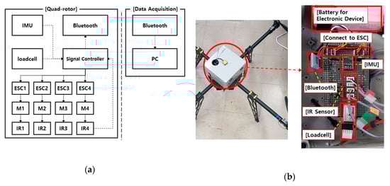 Constituents of quad-rotor for experiments. (a) Block diagram for data acquisitions; (b) electronic devices of quad-rotor.