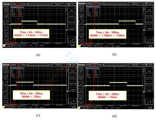 In Figure 5, the infrared sensor signals are measured by the oscilloscope to (M1 = 1715 us), (M2 = 1780us), (M3 = 720 us), and (M4 = 732 us). In Figure 6, the infrared sensor signals are measured by the controller to (M1 = 1712.52 us), (M2 = 1788.12 us), (M3 = 720.52 us), and (M4 = 736.29 us). The errors between the measured signals by the controller and the oscilloscope are (M1 = 2.48 us), (M2 = 8.12 us), (M3 = 0.52 us), and (M4 = 4.29 us), and the maximum error occurs in M2. The error resulting from the oscilloscope’s time/div resolutions is also included in the infrared sensor signal measurement, so the rotational speed measured in that system can be considered almost correct.