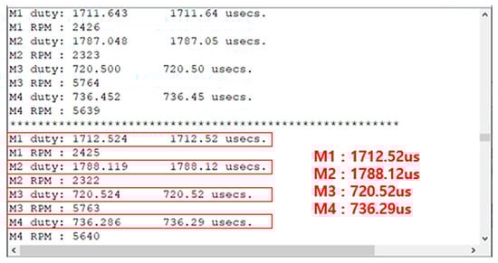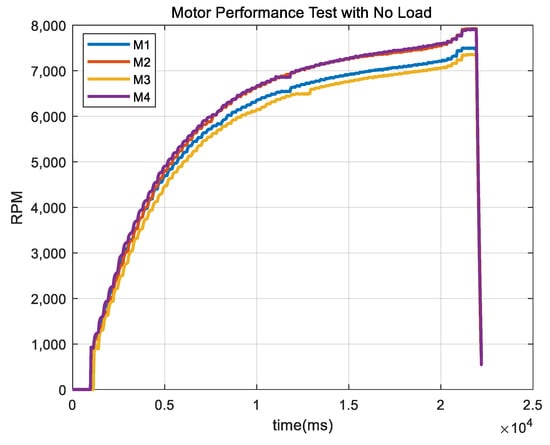 During the experiment, data were received at 40 ms intervals; the horizontal axis is the experiment’s time, and the vertical axis is RPM. Figure 8 shows that there is a performance error despite using the same model of motor and ESC. M1 and M3 started the first rotation at 1.15 ms, and M2 and M4 started at 1.16ms. The highest performing motor is M4, and the lowest performing motor is M3. The error between the two motors is up to 682 rpm for the same control signal.