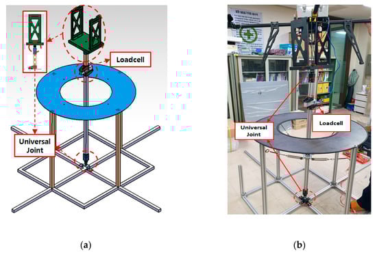 In Figure 7, the degrees of freedom of roll, pitch, and yaw were established by a universal joint at the center axis of the bottom of the testbed. The upper and lower link were combined into a loadcell to measure the vertically-generated thrust of the quad-rotor, and sensor data and rotational speed were transmitted to PC via Bluetooth.