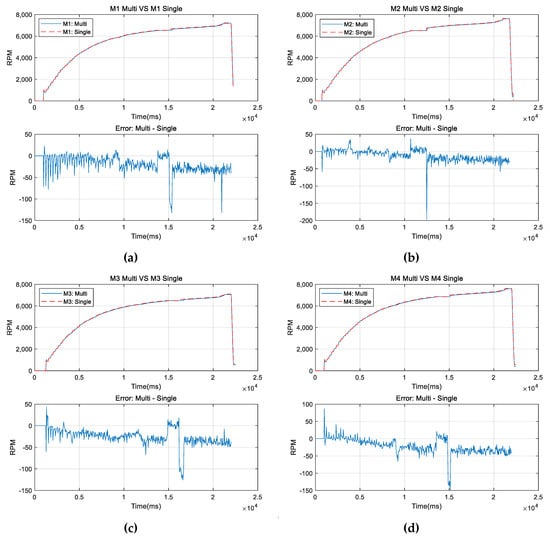 The Experiment B result of motor speed response to changing control signals when only one motor drives. (a) M1: single driven vs. multi driven; (b) M2: single motor vs. multi motors; (c) M3: single motor vs. multi motors; (d) M4: single motor vs. multi motors.