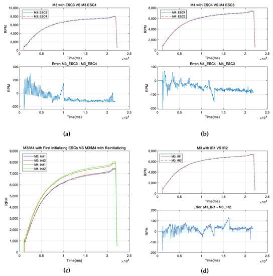 Figure 10a shows the rotational speed of M3 measured in Experiments A and C (a), and Figure 10b shows the rotational speed of M4 measured in Experiments A and C (a), respectively. The maximum errors (M3: 3.35%) and (M4: 3.77%) of each motor in Figure 10a,b are similar to the experiment shown in Figure 8, and as a result, the ESC is not the cause of the motor’s performance error. Figure 10c shows maximum errors (M3: 3.86%) and (M4: 3.54%) and still shows that the performance of the M4 is significantly better than that of the M3. The initialization of ESCs did not affect motor performance errors. Figure 10d shows the rotational speed of M3 measured in Experiment A, and the rotational speed of M3 measured in Experiment C (c), respectively. The results of Experiment C (c) also show similar results in Figure 8 and indicate that the performance error was not caused by a measurement error. The results of Experiment C in Figure 10 show that the performance error between motors occurs in motors, although it is the same model motor.