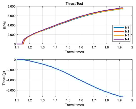 Experiment A was carried out by simultaneously driving all the motors in the quad-rotor with the motor-driven signal change procedure to measure motor performance error. Figure 8 shows the results of Experiment A.