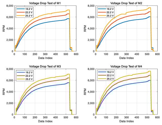 In Figure 13, the reduction rate of motor speed due to voltage drop is calculated except before the motor is stabilized and after the motor is stopped. The mean of Mx RPM (22.2 V)/Mx RPM (25.2 V) for each motor is about 0.889, and the mean of Mx RPM (19.2 V)/Mx RPM (22.2 V) is about 0.87. This result shows that the reduction of the rotational speed of the motor by the battery voltage drop is almost linear. The results of Experiment E shown in Figure 12 and Figure 13 indicate that the motor-driven signal must reflect the battery voltage drop to achieve the desired thrust during a quad-rotor flight.