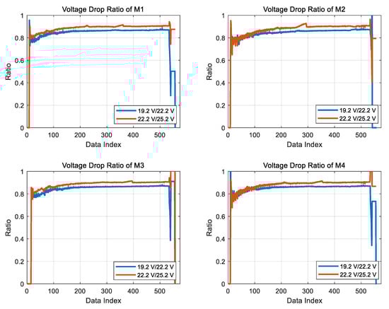 Table 3 shows that M2 and M4 motors still perform better than M1 and M3, even when the battery voltage drops. It also shows that under all battery voltage conditions, the ranking of the motor’s maximum rotational speed is (M2 > M4 > M1 > M3). The correlations between RPMs by changing voltage are shown in Figure 13 by the ratio of (Mx rpm at 25.2 V) to (Mx rpm at 22.2 V) and the ratio of (Mx rpm at 22.2 V) to (Mx rpm at 19.2 V).