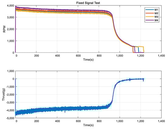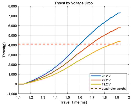 Experiment E showed that the reduction in battery voltage affected the rotational speed of the motor and that the rotational speed of the motor was reduced almost linearly. Based on the results of Experiment E, Experiment F is performed to verify the effect of reduced battery voltage on thrust. The weight of the quad-rotor used in the experiment is about 4114 g and the flight starts when the total thrust of the four motors exceeds the load. Using the experimental results in Figure 11, the control signals for each motor are selected—(M1: 1.60 ms), (M2: 1.59 ms), (M3: 1.59 ms), and (M4: 1.58 ms)—so that the total sum of thrust is close to 4,114 g, and the signals are maintained until the motor is no longer rotating. Figure 14 and Table 4 show the results of the experiment.