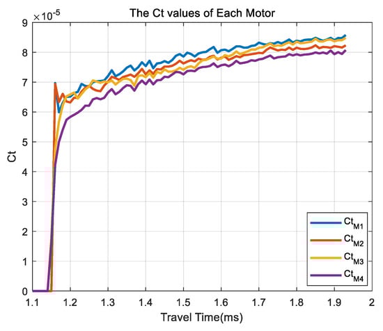 In Figure 15, the range of for each actuator is shown as (M1: 5.9914 × 10−5–8.5758 × 10−5), (M2: 5.67198 × 10−5–8.48079 × 10−5), (M3: 6.33296 × 10−5–8.22869 × 10−5), (M4: 4.22985 × 10−5–8.07188 × 10−5). Experiment A and Experiment D, showed that increasing the high time of the motor-driven signal increases the rpm, and increasing rpm increases the thrust. Figure 15 shows the values calculated using the results and Equation (3), and the changes of value for each actuator are observed with a similar shape. This shape shows the motor’s performance difference as a gap in the value of each motor, and the highest performance M4 is the smallest. Table 5 shows the values at similar RPMs. In Figure 8, M2 and M3 show significant performance error, but the values in Table 5 are similar, and the performances of M2 and M4 are similar, but the differences in values are significant. This means that the propeller states of M2 and M3 are similar, and the propeller states of M2 and M4 differ. This shows that is also variable according to the change in the RPM of the propeller, and the results of the calculation by fixing as a constant are shown in Figure 16.