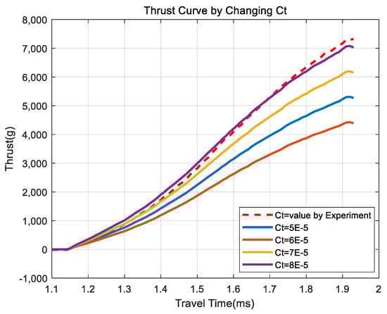Figure 16 is the result of calculating as a constant, and the has changed to those of 5.0E-05, 6.0E-05, 7.0E-05, and 8.0E-05 in the range shown in Figure 15. Even with very small changes in the , the thrust of each motor, which is the control input, is showing a significant error. The thrust calculated from the of 5.0E-05, 6.0E-05, 7.0E-05, is significantly lower in performance, and the of 8.0E-5 with the most similar results is also shown to be of a higher performance after the initial start and lower performance while reaching the maximum RPM. This result means that should be reflected as a variable element when modeling quad-rotor.