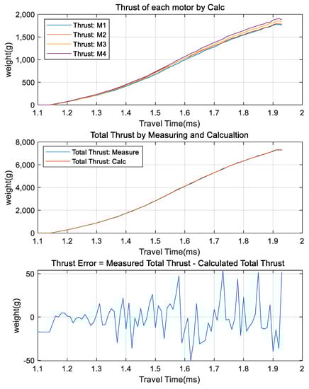 Based on the results of the previous experiments, Experiment D was performed to determine the effect of motor performance error on the thrust of the quad-rotor. Thrust was measured by carrying out the experiment following the motor-driven signal change procedure.
