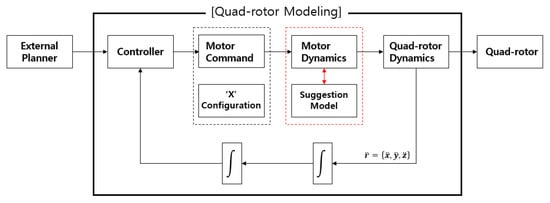 In this paper, we verified the response characteristics and performance errors due to the drive part and battery voltage drop, which are composed of the same hardware through experiments and examined the effect of the error on the quad-rotor. It also presented how to construct a motor model to reflect the performance of the actual motor and achieve accurate thrust in the quad-rotor model. Figure 19 shows one of the typical quad-rotor modeling methods [].
